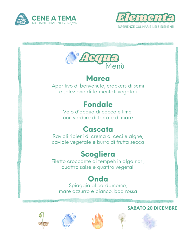 Cinque cene vegan, ognuna ispirata a un elemento — Terra, Acqua, Fuoco, Aria e Etere — per esplorare l’armonia tra gusto, equilibrio e sostenibilità.